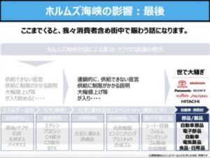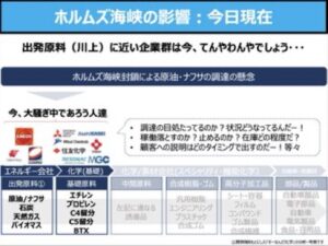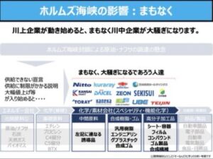 ①原油・ナフサ(今ここで大騒ぎ) ②化学メーカー(まもなく大騒ぎ) ③素材メーカー ④自動車・電機 ⑤そして最後は消費者